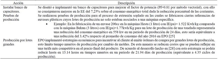 Teniendo en cuenta los resultados obtenidos durante la AE realizada y las condiciones económicas de EPO Ltda., se implementaron una serie de acciones que permitieron mejorar el desempeño energético y reducir el consumo de energía en la organización. La Tabla 8 presenta las acciones implementadas en EPO Ltda., y los beneficios obtenidos.