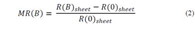 The magnetoresistance (MR) was measured using a Hall system equipped with a variable voltage supply (0-30 V), a current supply (0-1×10-3 A), and an electromagnet (0-0.5 T). The value of MR was evaluated by using eq. (2):