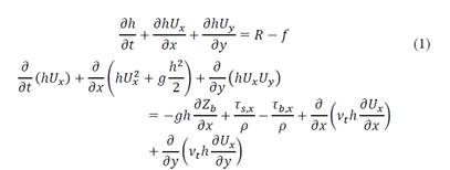 Where h is the depth, Ux and Uy are the horizontal velocities averaged in the depth, g is the acceleration of gravity, ρ is the density of water, Zb is the bottom elevation, τs is the friction on the free surface produced by wind, τb is friction of the bottom and νt is the turbulent viscosity. The mass balance is complemented by rainfall intensity (R) and infiltration rate (f).