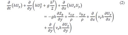 Iber solves complete two-dimensional Saint Venant equations and incorporates the effects of turbulence and surface friction from wind from a numerical model of finite volumes [12]. Eqs. (1) and (2) represent the conservation of mass and momentum (2D), respectively.