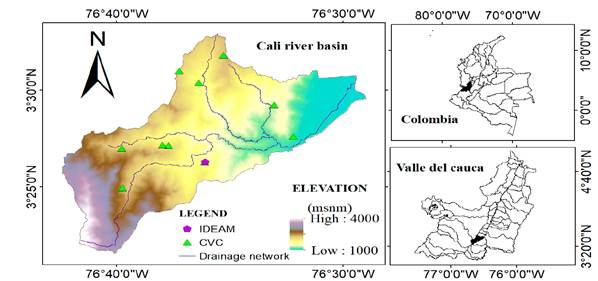 The Cali river basin is located in the department of Valle del Cauca (Fig. 1), and has an area of approximately 215 km2, with altitudes between 4000 mamsl and 1000 mamsl, and precipitation varying between 3600 and 1200 mm in the upper and lower regions respectively. Its main channel originates in the Farallones de Cali mountains and discharges into the river Cauca [19].