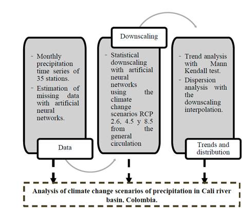 Resumen: Estudiar el comportamiento futuro de la precipitación en las cuencas hidrográficas es un tema vital cuando se habla realizar un correcto ordenamiento territorial de estas, ya que esto permitiría disminuir la vulnerabilidad y mitigar desastres. Por esta razón, este estudio se enfocó realizar un análisis de los escenarios de cambio climático en la cuenca hidrográfica del río Cali; partiendo de una base datos de precipitación mensual de 35 estaciones y Modelos de Circulación General (GCM) del conjunto de datos CMIP5, con lo cual, se realizó una reducción de escala estadística de los escenarios RCP 2.6, 4.5 y 8.5 mediante Redes Neuronales Artificiales y posteriormente se analizaron los cambios que se presentaran en los periodos 2017-2058 y 2059-2100. Estos análisis permitieron establecer que los diferentes escenarios analizados afirman que en los años venideros existirá un desplazamiento de la precipitación de la zona alta a la media y baja de la cuenca.