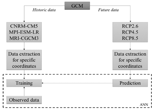 The downscaling of future precipitation scenarios consists in comparing a General Circulation Model (GCM) with actual local or regional data (precipitation values taken from the meteorological stations). In other words, the resolution of the GCM is increased with the aim of eliminating the existing bias and, in this way, concentrating the data to a local level [9,24]. The ANNs can be used for this method, thanks to their capacity for associating both input and output non-lineal variables [11]. First, the historical data and the future scenarios of the CNRM-CM5, MPI-ESM-LR and MRI-CGCM3 models downloaded from CMIP5 databases are obtained for the specific coordinates of each meteorological station. The neural network is trained using the historical databases and a monthly precipitation prediction is made using the scenarios. This process is shown in the diagram in Fig. 3.