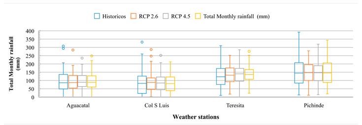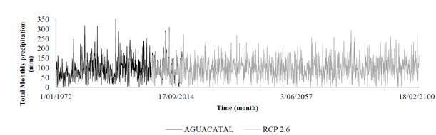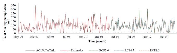 It should also be noted that the validation of the different Climate Change precipitation scenarios has an average correlation of 86.4% for the RCP8.5 scenario, 85.8% for RCP4.5 and 84.1% for RCP2.6. To demonstrate said distribution, fig. 6 presents the estimated and projected values for each scenario. The Aguacatal station reached a correlation of 95% for the training period (1972-2005) and 98% for the validation period (2005-2016) in conjunction with scenario RCP2.5 and 93% for scenarios RCP 4.5 and 8.5.