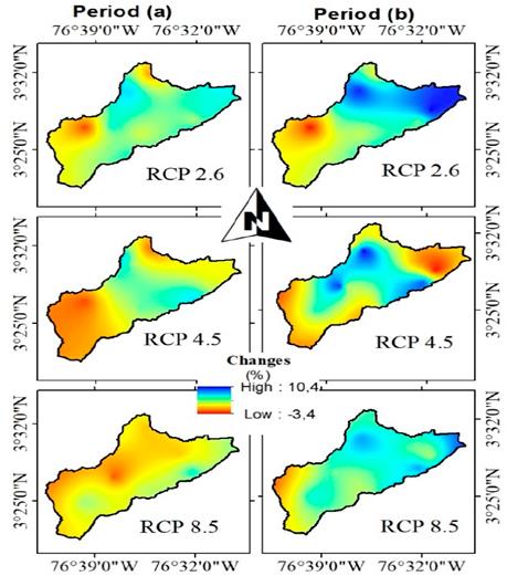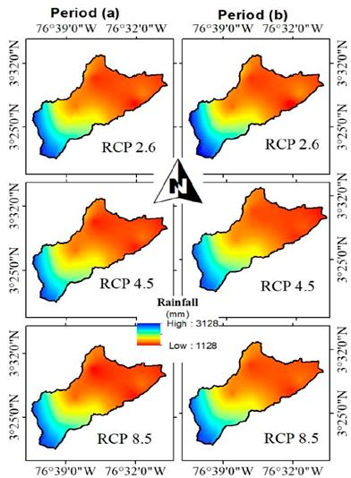 The distribution of the average annual precipitation in the different Climate Change scenarios presented higher levels in the basin’s upper and middle areas in comparison with its lower areas for Period a (2017-2058) and Period b (2059-2100). Similarly, precipitation in scenario RCP2.6 presents higher maximum average precipitation levels in both periods with values of 3125 and 3128 mm respectively. For scenario RCP4.5, on average, the maximum levels are lower with values of 3045 and 3043 mm, and the minimum levels have values of 1138 and 1132 mm consecutively for each period. Finally, for scenario RCP8.5, there are maximum levels of precipitation of 3086 and 3096 mm and minimum levels of 1131 and 1175 mm respectively (Fig. 8).