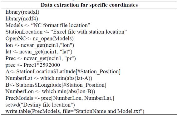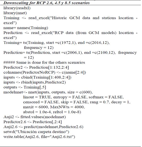 Using the actual data and the information obtained from the 3 GCMs and their respective climate scenarios RCP 2.6, 4.5 and 8.5, the Multilayer Perceptron neural network was trained with data from January 1972 to December 2016. Additionally, 3 layers (input layer, hidden layer and output layer) were used in the network, with 600 neurons for the hidden layer with a tangent hyperbolic activation function and 6000 interactions. Subsequently, with this same network, the future precipitation from January 2017 to December 2100 was predicted, using the projected data of the above-mentioned GCMs and their scenarios. Fig. 4 shows the diagram of the procedure design, as well as the script that was used for its implementation in table 3, based on the R package “nnet” [30].