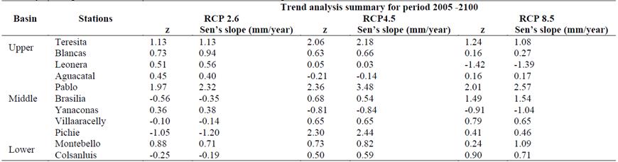 The analysis of the trends using the Mann Kendall non-parametric test found that, over the coming years, the river basin will be subject to an upward trend. However, it is important to note that in the middle area of the basin, for some stations, in the RCP scenarios 4.5 and 8.5, there are downward trends. Additionally, the size of the precipitation depth, calculated using Sen’s slope, ranges between 0.3 and 2.2 mm/year in the upper area, 3.5 and -1.4 mm/year in the middle area, and between -0.2 and 1.1 mm/year in the lower area, from which it can be inferred that the middle zone will suffer the greatest changes in the future (table 4). These results match those obtained by Cardona et al. (2014) [36] from an evaluation of precipitation trends in the Cali river basin for the 1954-2010 period, where they found that precipitation trends generally increased by 67% in the stations located within the basin, especially those in the east, with an average increase of 0.3 mm/year. For these reasons, it is predicted that precipitations in the basin will continue to rise in the future, as has been seen historically.