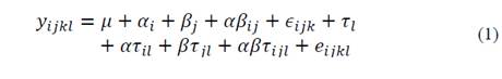 in which, Yijkl is the observed value of the replicate k of the i-th temperature by j-th duration at time l; μ is a constant; αi is the effect of i-th temperature; βj is the effect of the j-th duration of the thermal stress; αβij is the interaction between i-th temperature and j-th duration; ϵijk is the whole-plot error; τl is the effect of the time; ατil is the interaction between i-th temperature and l-th time; βτjl is the interaction between j-th duration and l-th time; αβτijl is the interaction between i-th temperature, j-th duration and l-th time, and eijkl is the subplot error.