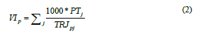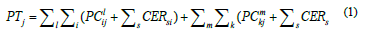 where l represents all primary buildings and m all secondary buildings in the city, respectively; CERik represents bonuses and penalties depending on building proximities i and s (or k and s, respectively). CERik determines the closeness between two buildings if not more than 3 boxes separate them, and PCij is the total score of building i for Development Index j to which it pertains. Thus, the total score of the index is calculated.
