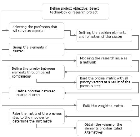 Fig. 2 shows the methodological approach employed, which is based on the ANP method. A case of the selection and prioritization of the five technologies performed by the OTRI of the University of Valle in Cali, Colombia, is used to illustrate the proposed methodology. The activities performed are explained below: