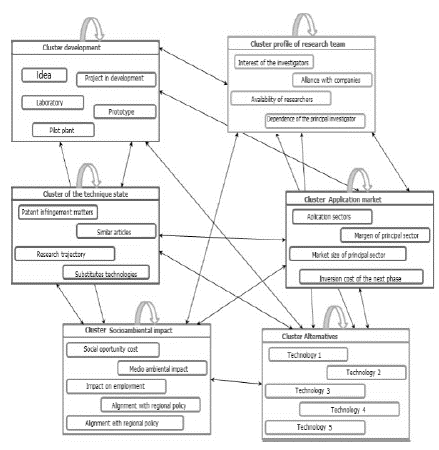 In the particular case of Technology No. 1, several types of prevalence were identified: in the Development state cluster, it was the lab element because the technology is at that stage. In the Research Team Profile cluster, it was the inventor availability. In the cluster State of the Technique, substitute technologies dominated. In the Market and Application cluster, sectors of application and market size dominated.
