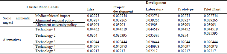 Obtaining the priorities of the alternatives (prioritized technologies). Three matrices of results were constructed: the original matrix, which is constructed with all the priority vectors of the relationship between interrelated elements; this matrix is multiplied by the weighting results of the procedure described in the previous step (Fig. 7). Finally, this weighted matrix (Fig. 8) is raised to the nth power until the row values of each column stabilize, which is called limit matrix. In the support software SuperDecisions®, [30], all these matrices are obtained once the paired comparisons are performed.