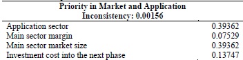 In Superdecisions, these results can be observed using the "Synthesize" command, as indicated in Table 2, in which the priority of each alternative (extracted from the limit matrix) and the normalized data can be observed. This table indicates that the technology with the greatest potential for transference is Technology No. 1, since it has the highest scores for all elements. One of the advantages of this method is that the limit matrix also shows which elements (other than the alternatives) influenced the decision as a whole; an example of this is presented in Table 3, which shows that "Application sector" and "Main sector market size" were the factors with the greatest weight in the decision within the "Market and Application" cluster.