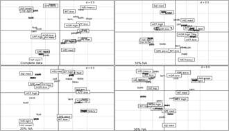 Figure 1 illustrates four first factorial planes of these analyses: MCA with complete data and MCAadp with 10%, 20% and 30% of NA. It is observed how as the missing data increase, some typologies and features that were found in the complete data are lost. However, Figure 2 shows the comparison between the complete data and matrices with missing data where the iMCA was used. It is observed that some typologies are also lost when the number of missing data points increases. This type of analysis with the factorial planes becomes more difficult because it is a visual analysis and there should be an indicator describing the characteristics of the variables and individuals in these two axes. The proposed indicator is the descriptive power (λ1 + λ2) / Σ; with such an indicator, the percentage of variance explained in those two axes is found.
