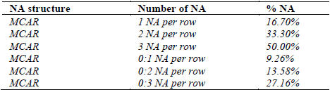 It is also important to mention that the NA percentage is calculated based on the total number of records (27 ∗ 6). In this article, the work is performed with a maximum of 50% of missing data; the NA percentage in the last three scenarios is randomly generated. To study the presence of NA in a more general and random manner, different simulations were performed, as shown in Table 4, where the records per individual will have a maximum of three NA per row (not exceeding 50%). One thousand matrices are generated for each NA percentage: 5%, 10%... 50%, i.e., there will be 7000 simulated matrices and they are compared with the complete data case.