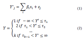 In an ordered logit regression model, level k of the observed response in the ordinal dependent variable Y is given by the relation between a lineal estimator Y’j , constructed from a set of explanatory variables xi multiplied by the coefficients βi to be estimated, plus a component of error εj, and some thresholds tk-1 that must also be estimated. This formulation is summarized as indicated in equations (1) and (2).