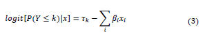 The probability of the response variable Y corresponding to a category smaller than k, is given by equation (3), where the logit function of such probability is equal to the threshold of the given category minus the linear estimator.