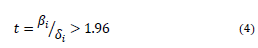 Note that the regression coefficients ßi correspond to the log-odds ratio of the independent variable against the dependent variable. Besides, the vector of coefficients ßi does not depend on the number of categories j, so one can assume that the connection between Y and xi is independent of this value, so the log-odds ratio of probability is considered constant throughout all k points of response [26]. Hence, by estimating the values of the regression coefficients and their significance level, it is possible to identify the link between independent and dependent variables. The significance of the coefficients was evaluated through the Student's t-test, where the t-statistic is equal to the value of the coefficient divided by its standard deviation (equation 4). This value must be greater than 1.96, assuming a significance of 95%, to reject the null hypothesis that the coefficient is statistically equal to 0.