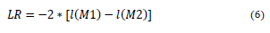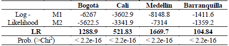 Likelihood ratio tests were applied to compare the M1 and M2 models for each city. In this test, the log-likelihood ratio was estimated according to equation (6), which distributes Chi2 with degrees of freedom equal to the difference in the degrees of freedom of the models. This statistic allowed us to evaluate the null hypothesis that the simple model (M1) is statically equal to the complex model (M2), considering that M2 is a more general version of M1.