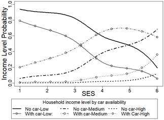 With the purpose of visualizing the difference in the interaction between SES and income depending on household characteristics, Figs. 3 and 4 show the probability distribution of having a determined income level given the SES in households with and without car for Bogotá and Cali. The probability changed when comparing two household of the same SES with and without car. Households with car had a higher probability of having a medium or high-income level and a lower probability of having low income.