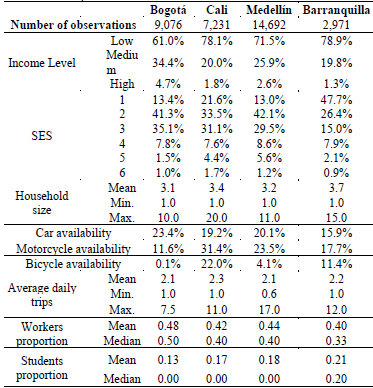 To carry out the evaluation of the SES as an explanatory variable for household income, we used data from mobility surveys of households in the four main cities of Colombia. This kind of survey collects information about trips made by the population and socioeconomic characteristics of users and their households. This information is generally used to develop transportation models, although the data are useful for other kinds of analysis.