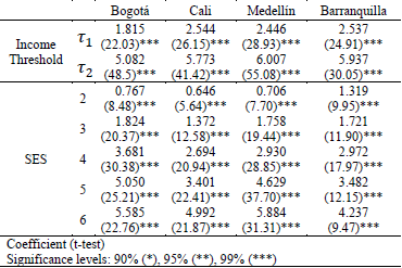 In all cases, the thresholds increase in value with the income level, and the SES coefficients are highly significant. In addition, the coefficients of strata 1 were less than one, with the exception of Barranquilla, which increases as the strata goes higher. This means that low SES households have a higher probability of belonging to a low-income level.