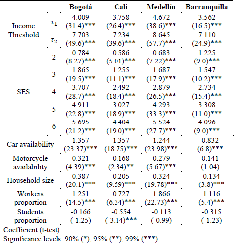 The cities included in the investigation were Bogotá, with a mobility survey from 2015, Medellín with information from the origin-destination survey of 2017, Cali, with the mobility survey from 2015 and Barranquilla, with a household survey from 2017. From this information, we estimated ordered logit regression models in which the dependent variable was the household income and the independent variables were the SES and other characteristics of the household. This methodology was chosen because in all databases the income is found as an ordinal variable divided into non-uniform ranges. With this framework, it was possible to determine the level of explanation that the SES has over income, and if there is a correlation between them.