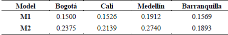 Regarding M2 models, the availability of a car or motorcycle in the household was significant and relevant in the prediction of income from SES, with exception of the motorcycle in Barranquilla, where the value of the t-test was 1.04, so it is not significant. The car coefficients were higher than those in Bogotá, Cali and Medellín, so a household with this kind of vehicle has a higher probability of having a higher income compared to one that does not have a car. In the case of the motorcycle, the value of the coefficient was less than one, so households with this attribute tend to have a lower income than those with a car.