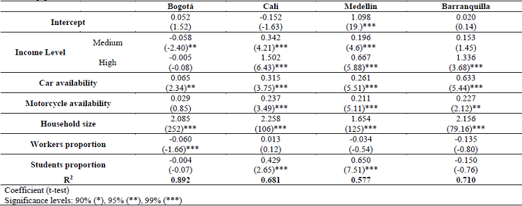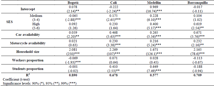 SES and income coefficients resulted in similar levels of significance for both models in all cities. Furthermore, when reviewing the coefficient values and t-tests of household characteristics, it can be noted that these attributes were highly significant, especially household size and car and motorcycle availability, the last one with the exception of Bogotá. These results indicate that the number of trips made by a household in a typical day depended heavily on these attributes. On the other hand, the coefficients of determination of the models by city were practically the same, so the fitness of the models that use SES and those with income was similar.