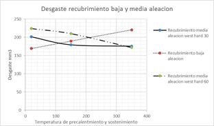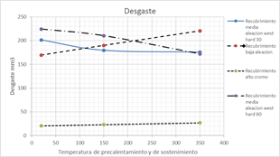 La temperatura de precalentamiento y de sostenimiento presentó influencia cuando se analizaron los recubrimiento realizados con electrodos AWS E11018 seguido de electrodos West Hard 400® y con material de última capa West Crome®, con dos y tres capas, esto debido al tratamiento térmico de revenido, aplicado a este material cuando se aumentaron las temperaturas hasta valores de trescientos cincuenta grados, generando mayor cantidad de martensita la cual mostro menor resistencia al desgaste vs. la austenita endurecible por deformación. Lo anterior no se encontró para los recubrimientos aplicados con soldadura AWS E11018, la cual presento una estructura con alta presencia de estructuras de tipo ferrita y perlita acicular, generando corte y deformación plástica en la zona desgastada. Igualmente, se encontró este comportamiento en los recubrimientos realizados con electrodo West Hard 65®, donde se encontró que los factores temperatura y número de capas si influyeron en el valor obtenido de desgaste, este depósito presenta una cantidad de elementos aleantes apreciable, dentro de ellos el cromo, formador de carburos, y que se ve afectada por procesos de dilución, lo anterior explicado por el endurecimiento secundario por precipitación de carburos [17].