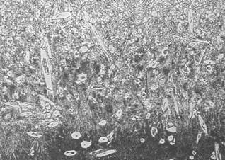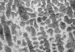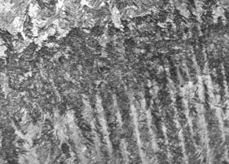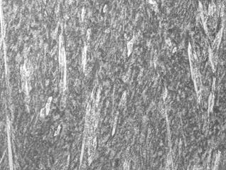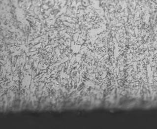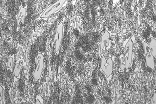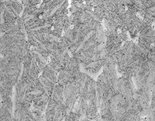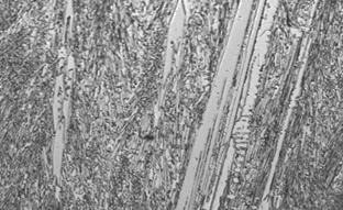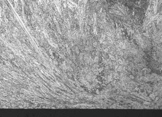 De acuerdo a la composición química encontrada en la Tabla 1 y comparando estos valores con las imágenes obtenidas por microscopia óptica y los difractogramas de las principales probetas, se encontraron las microestructuras mostradas en las Figs. 8 - 12. El material base principalmente mostró formaciones de ferrita y perlita ver Figura 9; los depósitos a partir de electrodos West Crome®, formaron altos contenidos de carburos aleados con cromo del tipo M7C3 y en matriz martensítica y austenítica, fig. 8, los electrodos West Hard 30® generaron depósitos de martensita, bainita, ferrita y carburos aleados con cromo finos en su mayoría, ver Figura 10; los recubrimientos obtenidos a partir de electrodos West Hard 400® debido a su alto contenido de manganeso produjeron depósitos de austenita, ver fig. 12; los electrodos West Hard 65® generaron depósitos compuestos de martensita con carburos de cromo finos, ver Fig. 11