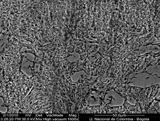 En este tipo de recubrimiento se obtuvo el difractograma mostrado en la Fig. 4, donde se observa la presencia de carburos de cromo y de hierro del tipo M7C3 [12], presencia de martensita y austenita. Al observar la figura 8 se encuentra la presencia de carburos de cromo con forma hexagonal (zona blanca). Estos carburos influyen en el aumento en la dureza de estos recubrimientos, alcanzando valores de 800HK, además de generar una barrera contra el desgaste abrasivo [13].