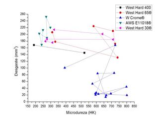 Los electrodos West Hard 30® y West Hard 65®, presentaron valores bajos de resistencia al desgaste por la presencia de carburos aleados finos comparados con las superficies de corte de la arena, notándose que a la temperatura de 350°C el West Hard 65 mejoró su resistencia al desgaste haciéndose comparable con el electrodo West Hard 400, vía la precipitación de carburos secundarios.