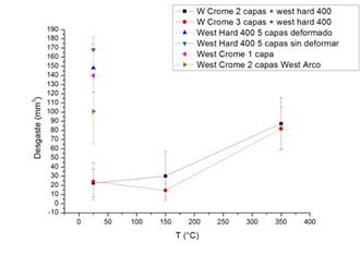 Para los depósitos generados con electrodo West Crome se encontró que para la temperatura de precalentamiento y de sostenimiento de 350°C, disminuía la resistencia al desgaste asociado probablemente a la transformación de austenita en martensita producto del revenido.