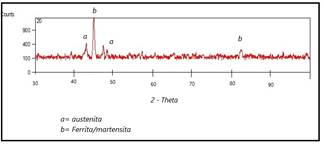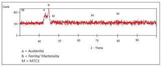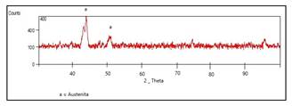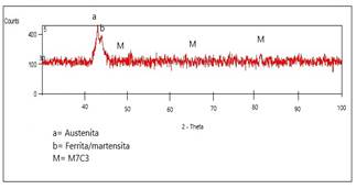 De acuerdo a la composición química obtenida de este recubrimiento, principalmente su alto contenido de manganeso, se encontró austenita como principal componente, ver Fig. 7. Este material tiene la particularidad de endurecerse por deformación, lo cual aumenta los valores obtenidos de dureza hasta 190HK.