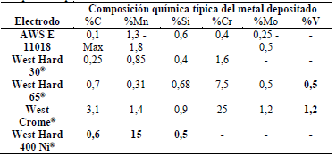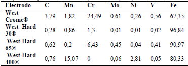 Después de realizar el análisis de desgaste abrasivo, se determinó que la capa depositada con electrodos West Crome ® el cual posee altos contenidos de cromo (25%) y carbono (3,1%) presentó el mejor comportamiento al desgaste de tipo abrasivo bajo norma ASTM G65-04, además se encontró que el material de relleno que presentó la mejor resistencia al desgaste abrasivo fue el depositado con electrodos West Hard 400®, depositando un acero austenítico (tipo Hadfield), esto debido a su alto contenido de manganeso, ver tabla 1, que al presentar un alto endurecimiento por deformación permitió una mejora en los valores de resistencia al desgaste, esta alta deformación se obtuvo por martilleo sobre la superficie obtenida.