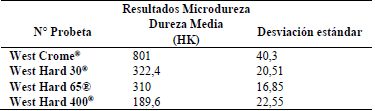 En sección metalográfica transversal en la zona cercana a la superficie de desgaste se determinó el valor promedio y la desviación estándar de cada probeta escogida, los datos se tabulan en la Tabla 3.