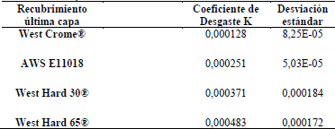 En la tabla 4 se muestran los valores obtenidos para este coeficiente de desgaste K, junto con los valores de desviación estándar, el valor medio se determinó para cada familia de electrodos. Estos valores coinciden con los reportados por Zum [11].