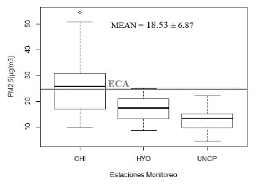 La concentración de masa de PM2.5 en las estaciones de monitoreo de calidad de aire UNCP, HYO y CHI fue de 12.7 ± 4.47 µg/m3, 17.1 ± 5.15 µg/m3 y 25.8 ± 10.99 µg/m3, respectivamente en la Fig. 2. Los resultados de PM2.5 del monitoreo de calidad de aire, nos indican el estado de la calidad de aire sobre Huancayo Metropolitano. Las concentraciones anuales más altas de PM2.5 se encontraron en las estaciones de monitoreo de CHI (25.8 µg/m3) y HYO (17.1 µg/m3). En contraste, la concentración anual más baja para PM 2.5 se observó en las estaciones de monitoreo de la UNCP (12.7 µg/m3). Por otro lado, el monitoreo de la estación de CHI ha superado los estándares de calidad de aire peruano, mientras HYO solo un día.