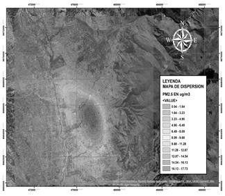 La dispersión de PM10 realizado para zonas topográficas simples y complejas, dieron como resultado que la dirección y la velocidad del viento esta condicionadas por las mismas, permitiendo esta un flujo libre en la dirección predominante en la rosa de vientos para la zona de topografía simple y un flujo turbulento en la zona compleja, también observaron que lo modelado y lo observado tiene concordancia para periodos de 24 horas [19]. La dispersión de concentraciones de PM10 presenta un decaimiento exponencial, demostrando que aproximadamente el 50% de los contaminantes de aire se deteriora en las distancias entre los 800 a 1000 m de la fuente, observando que se tiene una relación entre concentraciones y distancias [20].