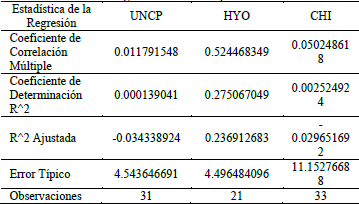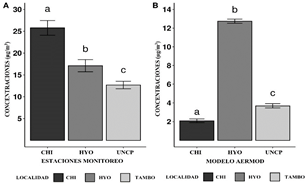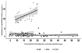 Para la determinación de la eficiencia del modelo AERMOD en la dispersión de PM2.5, se compararon los resultados del modelo AERMOD con los resultados provenientes del muestro de las tres estaciones de monitoreo calidad de aire (UNCP, HYO y CHI), se realizó una regresión lineal múltiple con la finalidad de obtener el coeficiente de correlación que se tiene entre las concentraciones de PM2.5 modelado y monitoreado.