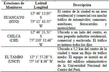 El estudio se llevó a cabo en la Provincia de Huancayo el cual tiene como Distritos Metropolitanos a El Tambo, Huancayo, Chilca (Huancayo Metropolitano), la Fig. 1 indica la localización de Huancayo metropolitano y estaciones de monitoreo. Esta se encuentra a unos 3500 metros sobre el nivel del mar y tenía una población aproximada de 507,075 habitantes [22]. La Huancayo Metropolitano está ubicada en el valle del Mantaro, que cubre un área de 319.4 km2. Está bordeada por montañas que actúan como barreras naturales para la circulación del aire y áreas agrícolas que producen cantidades significativas de diferentes cultivos (es decir, vegetales, maíz, papas) [23]. El clima en Huancayo Metropolitano se basa regularmente en los datos recopilados en el Observatorio de Huancayo (IGP) de 1966 a 2002. Las temperaturas más frías se registran en junio y julio (invierno) y los valores más altos son alrededor de octubre y diciembre. La temperatura promedio anual es de 11.9 1.2 C. La precipitación tiene dos estaciones marcadas: seca y húmeda. De junio a julio se registran las menores cantidades de lluvia, mientras que de enero a marzo se registra la mayor precipitación. Febrero es el mes con el registro más alto alcanzando un valor acumulado de 129.1 mm. La precipitación acumulada media anual es de 752 44,3 mm [24].