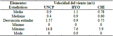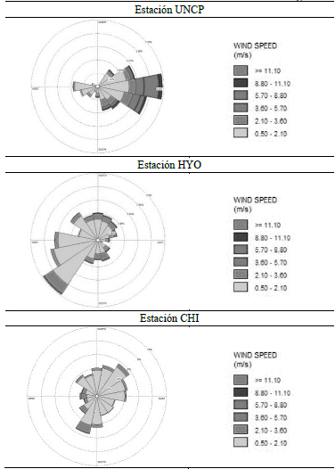 En la Tabla 2 se presenta los resultados obtenidos en el análisis de la magnitud de la velocidad y dirección del viento, se observa la rosa de los vientos para HYO, UNCP Y CHI. En estos gráficos se muestra el comportamiento de los vientos respecto a la velocidad y dirección de los mismos. Los valores medios mensuales de velocidad del viento fluctúan entre 0.5 y 8.8 m/s, solo en una ocasión se registró velocidades superiores a 11.11 m/s en la UNCP. Los vientos soplan en un rango promedio de 0.5 a 5.7 m/s en la UNCP, 0.5 a 3.6 m/s en HYO y 0.5 a 2.1 m/s en CHI. La rosa de viento no presenta uniformidad, debido a que se observa que la dirección de viento viene de diferentes lugares en HYO y CHI, mientras que se muestra una predominancia desde el Este hacia el oeste en la UNCP. Las rosas de vientos generada de las tres estaciones son diferentes para las distintas ubicaciones pero coincidentes con el mapa de dispersión generado por el modelo AERMOD, y esto explica (Silva y Arcos, 2011) que la dispersión de material particulado está afectada por las características de la superficie, siendo este un factor que incide en el transporte y arrastre, para el presente estudio las rosas de viento nos demuestra mayor estabilidad en la HYO y CHI mientras que para la UNCP no muestra una predominancia de viento que vienen del Este, y esta diferencia se debe a las características de la superficie de Huancayo Metropolitano. Tabla 3 se presenta un análisis estadístico de los datos de velocidad de viento.