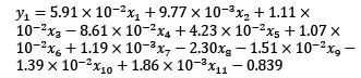 (12)Where, x1 is the quantity of PC (mg); x2, x3 and x4 is the relationship between encapsulating polymers, x5 is the concentration of the polymer (mg/mL water), x6 is the quantity of the polymer (mg); x7 is the volume of solvent (mL); x8 is the surfactant concentration (mg/mL water); x9 emulsion volume (mL); x10 is the ultrasound time (min), and x11 is ultrasound power (W).