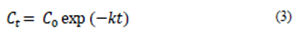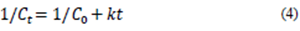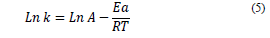 Additionally, the study evaluated the effect of temperature from the Arrhenius equation (Eq. 5), determining the activation energy (Ea) and the pre-exponential or frequency (A) factor, with T being the absolute temperature (K) and R the universal constant of gases (8.314*10-3 kJ/K* mol) [14, 23, 25]; where Ea was calculated from the slope of the graphic Ln (k) vs. 1/T.