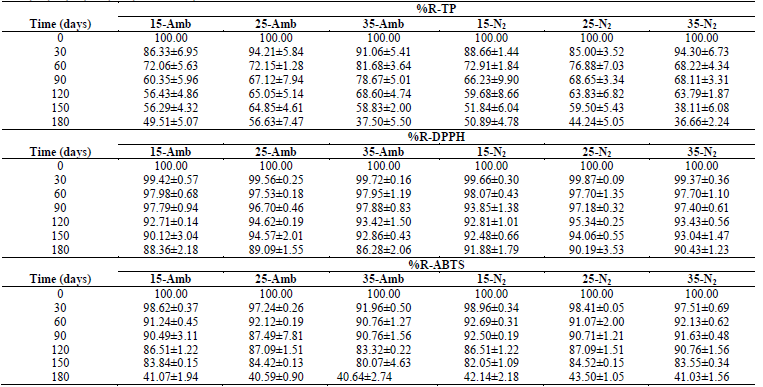 The ANOVA had statistically significant differences (p <0.05) in all the dependent variables, with respect to tS, treatment (Temperature-Packaging), and the Treatment-tS interaction; in general, during 180 days of storage under the conditions described, significant losses occurred in all the treatments, both in vitamins as in antioxidants; with greater %R-Vitamins and Antioxidants at lower TA, and in treatments where the CP+FAC was packaged with N2 (Tables 1 and 2).