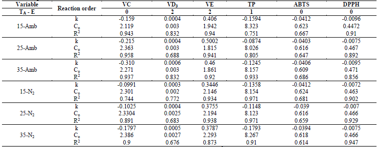 In VC, the correlation coefficients (R2), for all temperatures and types of packaging had - in general - values (0.9; the values of k show the degradation rate, which are higher for that packaged with ambient air than with N2 (higher values of k, lower stability) (Table 3). Similar behavior was reported by Romero-Braquehais [24], in liquid milk. While Shinwari and Rao [29], reported that ascorbic acid in berry marmalades and jams is more sensitive during storage after first-order degradation kinetics, where the storage temperature has a significant effect.