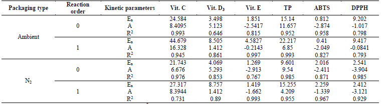 Vitamin E had a second-order kinetic degradation model, for all temperatures and packaging conditions, with similar behavior for liposoluble vitamins, the R2 were (0.9; rate constants (k) were higher for the samples packaged with atmospheric air than with N2 (Table 3), which indicates a slower degradation of the VE packaged with N2. The effect of storage temperature on the degradation of VE, for the zero-order and first-order kinetics, showed R2 (0.75 and (0.99 for EA and EN2, respectively, while the Ea was lower for the zero-order reactions and for that packaged with N2 (Table 4).