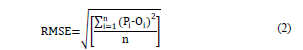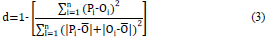 Where n is the number of observations, Oi and Pi are the observed and estimated values, respectively (i = 1, 2,... n), O and P are the averages of the observed and estimated values, respectively.