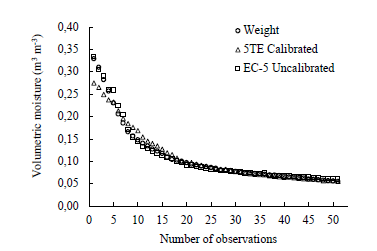 As shown in Fig. 1, the volumetric soil moisture values corrected with the calibration equation of each sensor are close to those calculated, but the soil moisture values of the 5TE sensor are closer to the curve determined by gravimetry. In the range from 0.33 to 0.08, the EC-5 sensor lost sensitivity, estimating soil moisture readings different from those calculated by gravimetry.